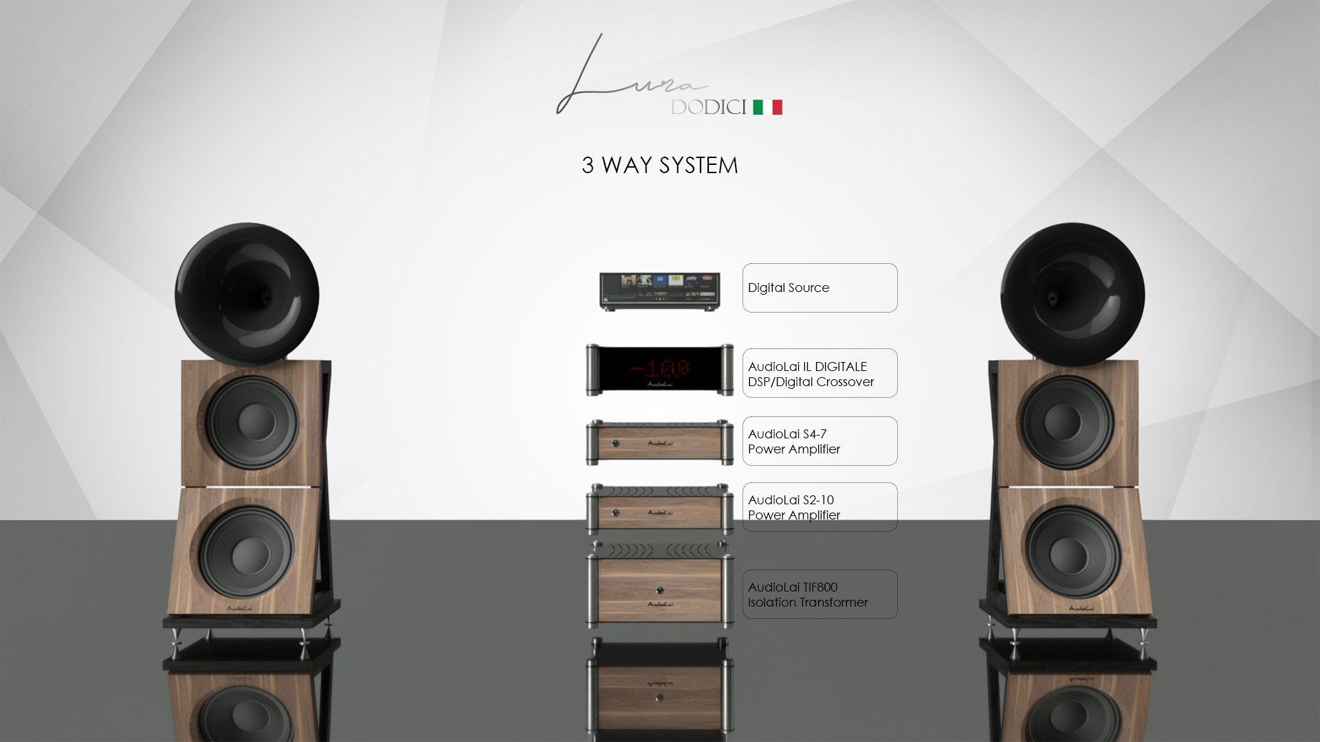 - Sistema a 3 vie che integra amplificatori ed elettronica AudioLai per il pilotaggio ottimale dei driver.